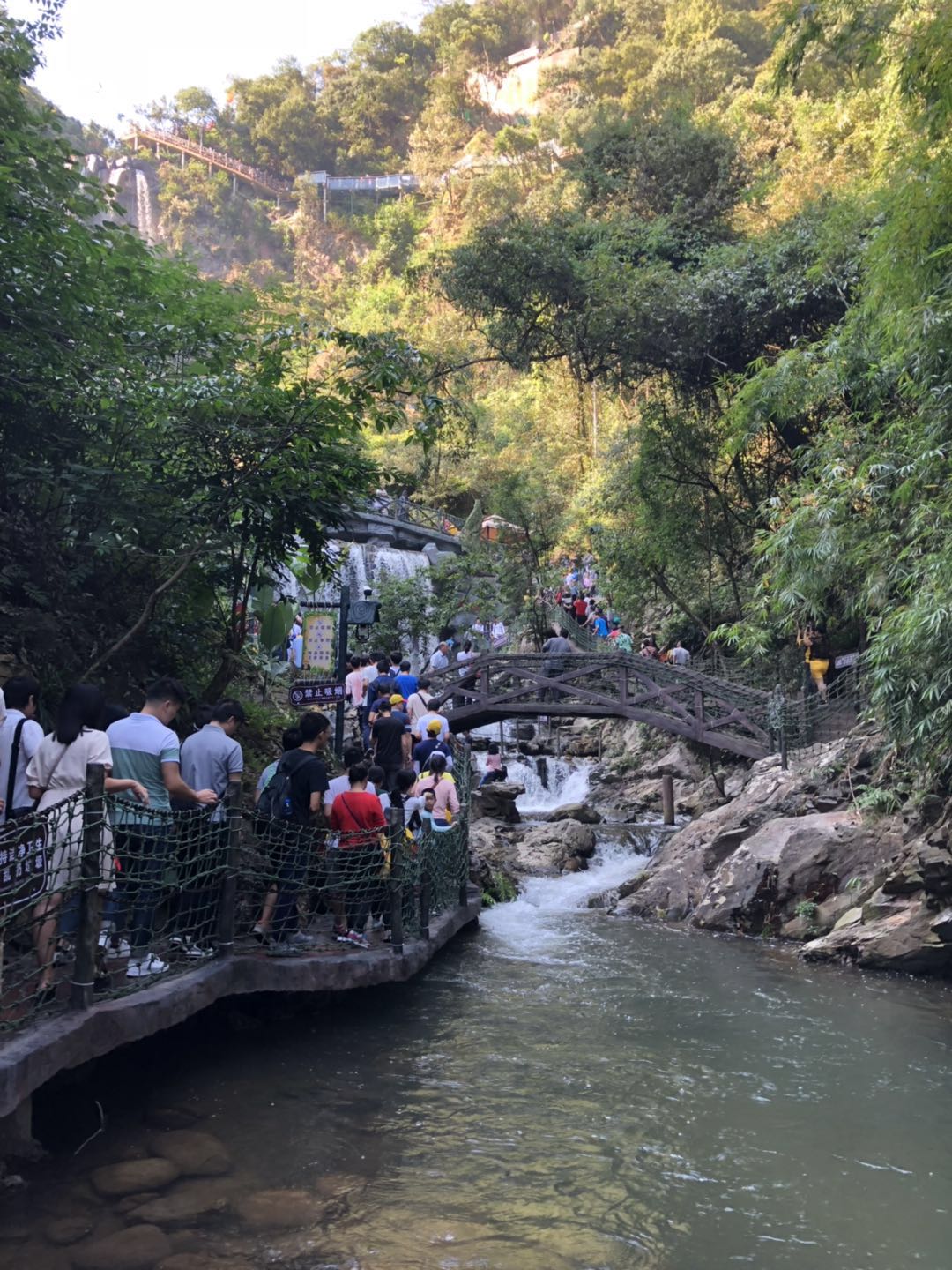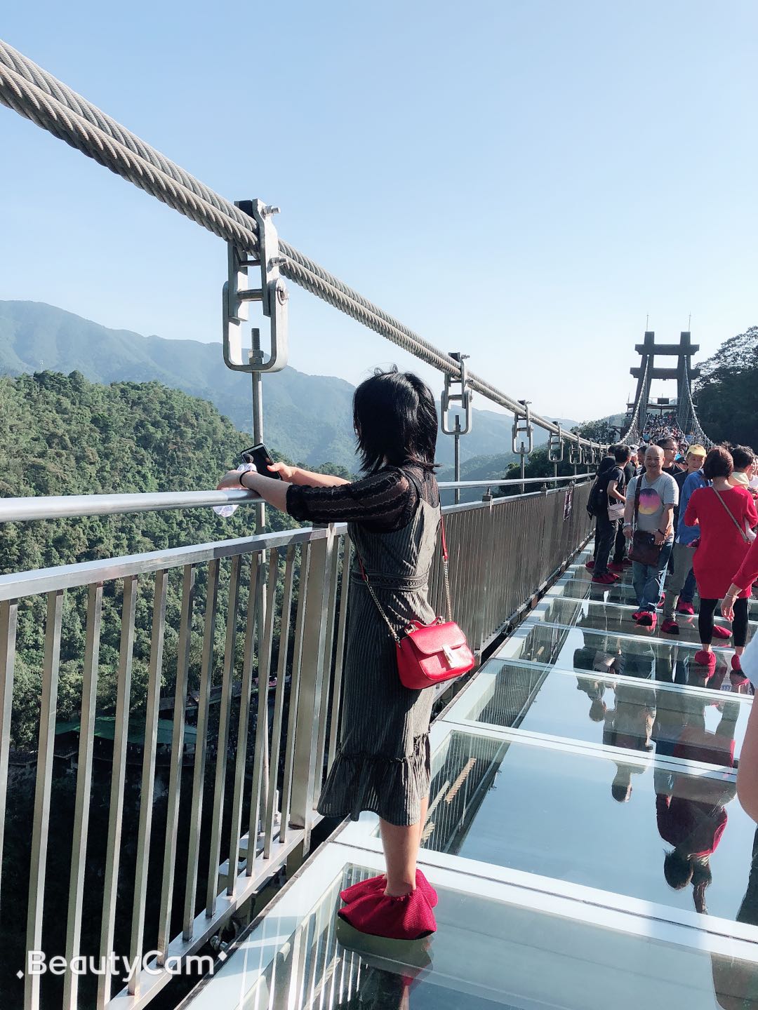 午飯過后,大家繼續(xù)趕往下一景點——古龍峽,早已聽聞古龍峽有一個長達三百多米的玻璃吊橋,想著馬上就能一睹風光,心里真是又激動又害怕。從山下一路上來,來往的人真是數(shù)不勝數(shù),雖然一路走走停停,但正好可以享受沿途的風景。一路上拍照留念,很快并到達玻璃橋的入口,看著橋面上熙熙攘攘的人群,內(nèi)心也不會感覺到那么害怕了;站在橋面上,微風拂面,真正感受到大自然的美好。
