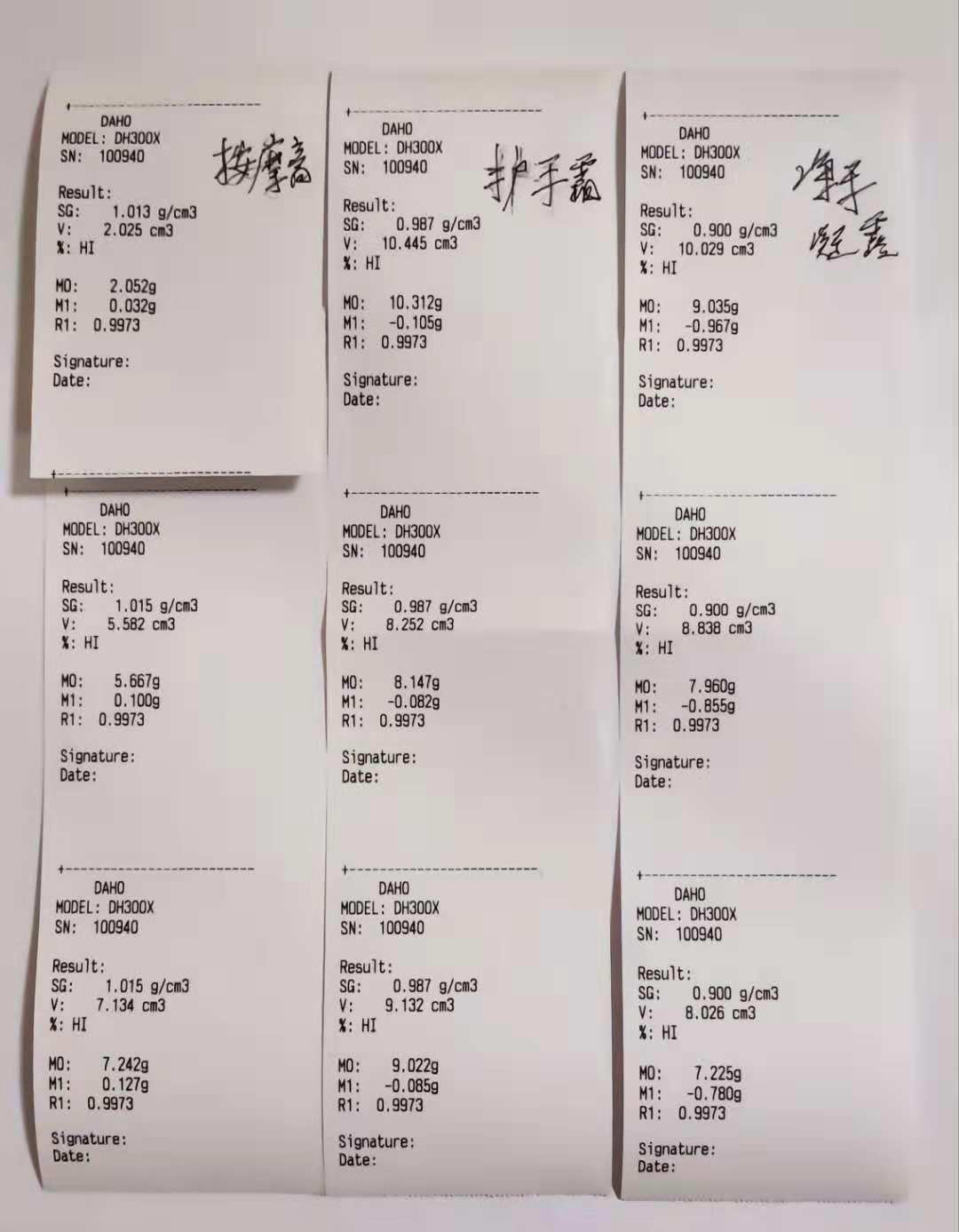 剛好最近有客戶寄膏狀樣品來測試,分別寄了三種樣品:按摩膏、護(hù)手霜、護(hù)手凝露;每種樣品分別取不同的重量測試了三次,其中護(hù)手霜與護(hù)手凝露三次的測試結(jié)果都相同,按摩膏有兩次的測試結(jié)果相同,一次的測試結(jié)果相差0.002,不過在誤差范圍內(nèi),由此可見,Dahometer達(dá)宏美拓牌密度儀的性能穩(wěn)定、測試重復(fù)性好,是值得入手的一款產(chǎn)品。以下是我司技術(shù)人員測試完之后的結(jié)果,供參考。